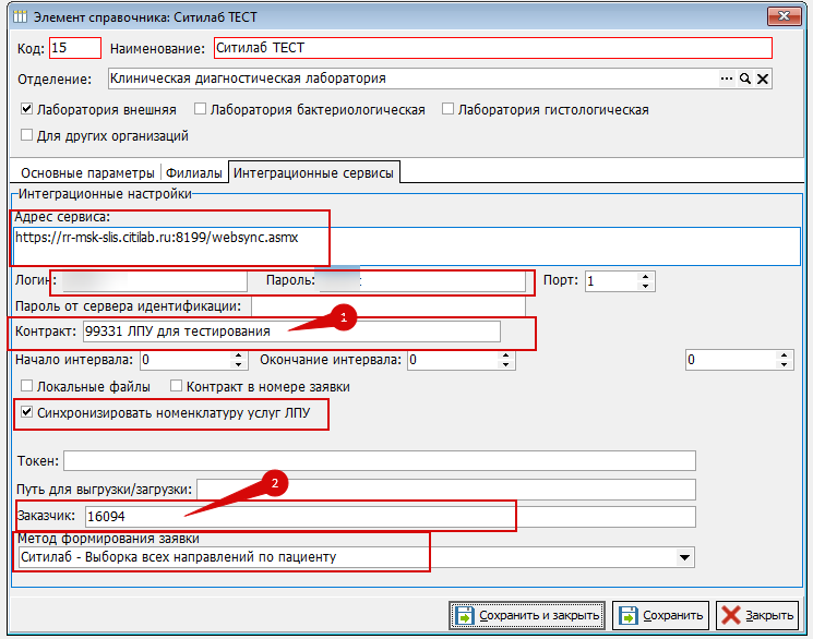2. Настройки лаборатории - заполняются поля, выделенные красным. В поле "Контракт" (1) указывается код ЛПУ и Наименование, через пробел, информацию лучше уточнить у представителей Ситилаб. Код и наименование ЛПУ печатается на этикетке. В поле "Заказчик" (2) указывается идентификатор ЛПУ в системе СИТИЛАБ, также уточнять у представителей внешней лаборатории.