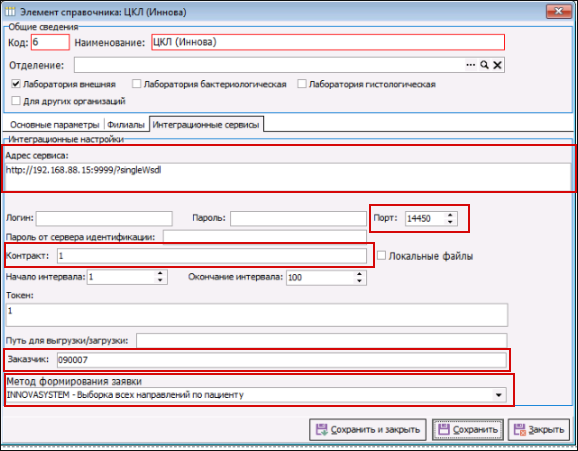Основной настройкой интеграции является настройка параметров обмена c внешней лаборатории справочника "Лаборатории ЛПУ". В зависимости от требований интеграций и способов обмена с интеграционными сервисами можно выделить основные поля для заполнения и те, которые заполняются для определенных интеграций.