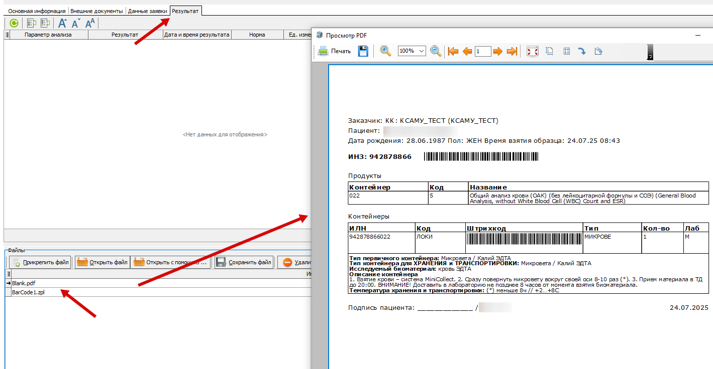 1. Если интеграцией предусмотрено создание этикеток на основании заявок самой внешней лабораторией и при отправке заявки происходит загрузка этикеток, их можно распечатать на вкладе "Результат":