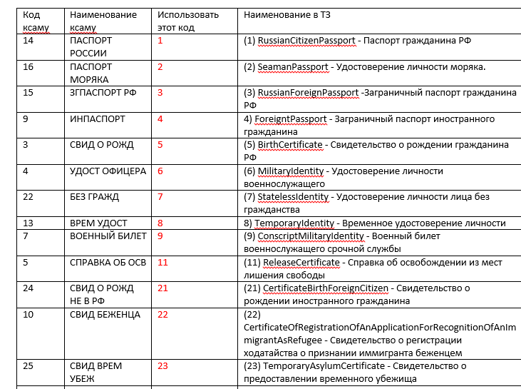 - Для документов удостоверяющих личность Инвитро использует свой справочник документов, с кодами, отличными от справочника КСАМУ "Тип документов удостоверяющих личность". Что бы не множить одинаковые справочники, коды документов из технического задания Инвитро зашили в саму интеграцию: