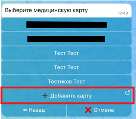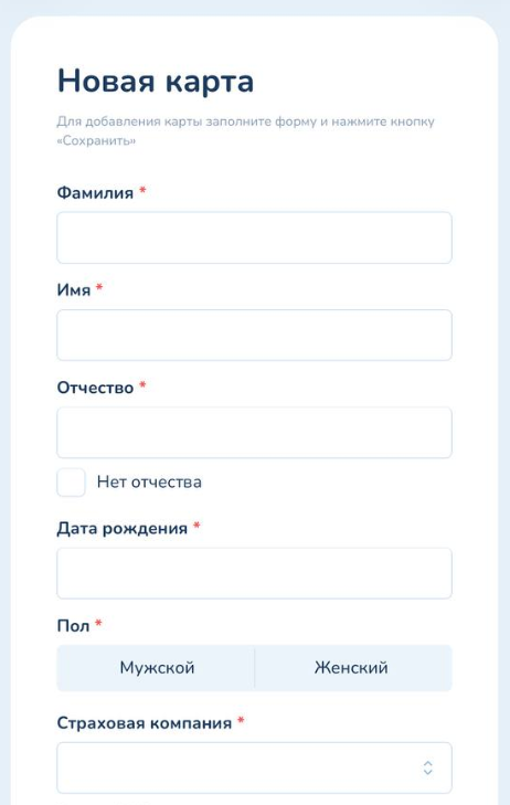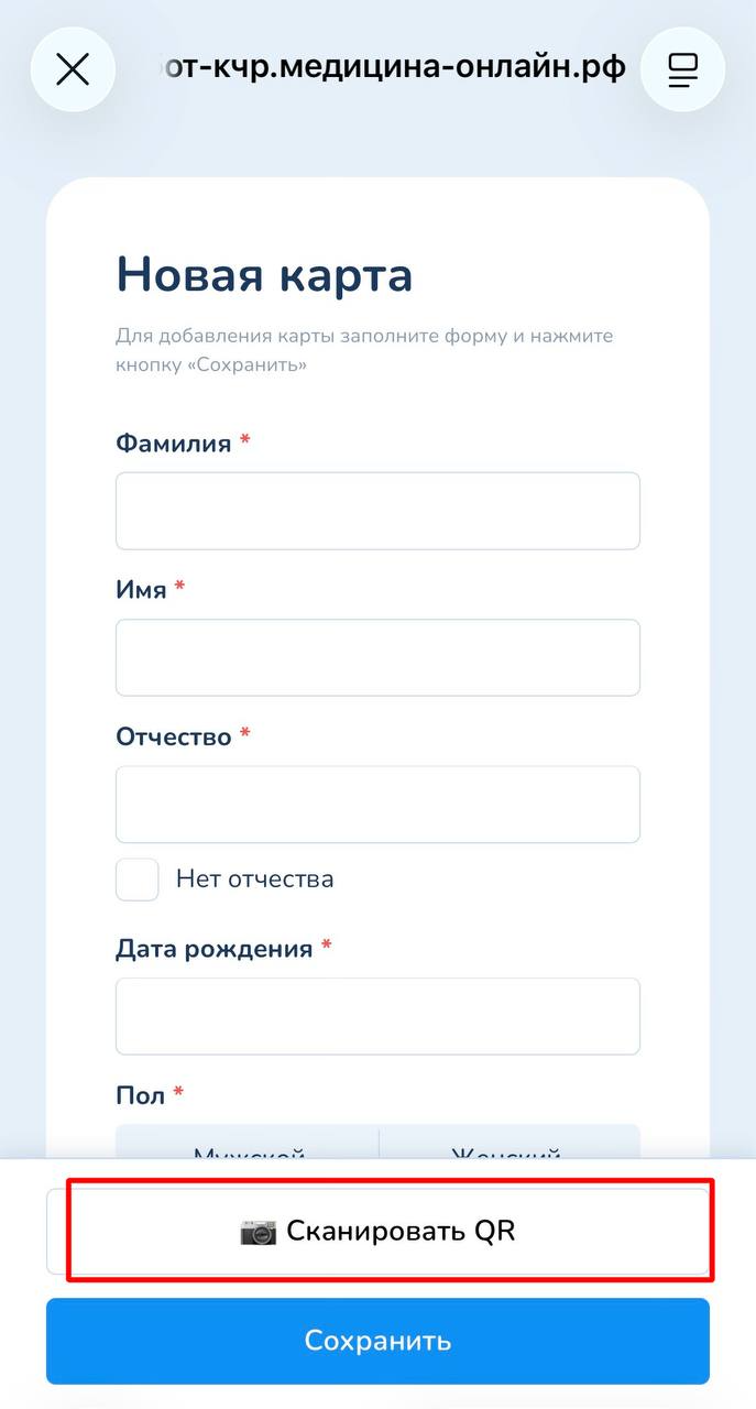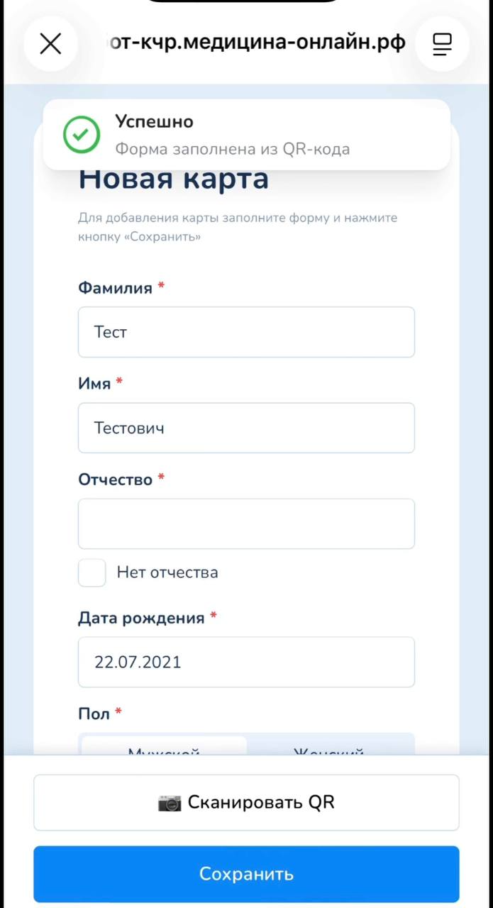Сканируете код с помощью телефона, где у вас открыто окно с камерой (Рисунок 7). После чего создается карта с автоматически заполненными данными (Рисунок 11). Из КСАМУ подтягиваются все заполненные поля карты, за исключением поля "Страховой полис", его нужно будет заполнить вручную.