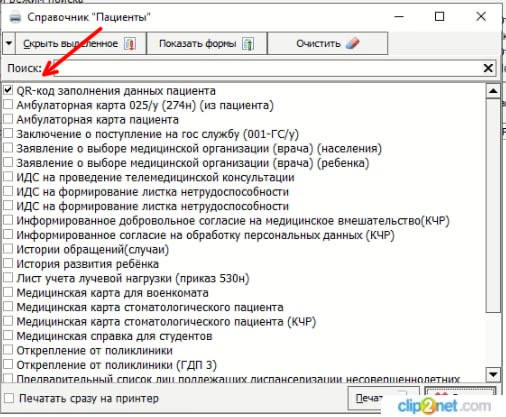 Затем в КСАМУ необходимо выбрать карту нужного пациента и нажать кнопку "Печать" (Рисунок 8), откроется окно, где нужно поставить галочку на функции "QR-код заполнения данных пациента" (Рисунок 8) и внизу нажимаете кнопку "Печать"