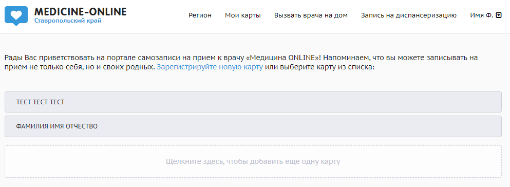После успешной авторизации на госуслугах происходит переход на портал медицина-онлайн в раздел «Мои карты». Карта пациента создается автоматически по данным из личного кабинета госуслуг.