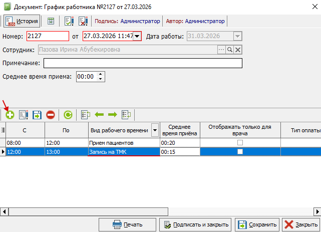 Далее добавить новое расписание с видом рабочего времени "Запись на ТМК", нажав на кнопку "+" (рисунок 5).