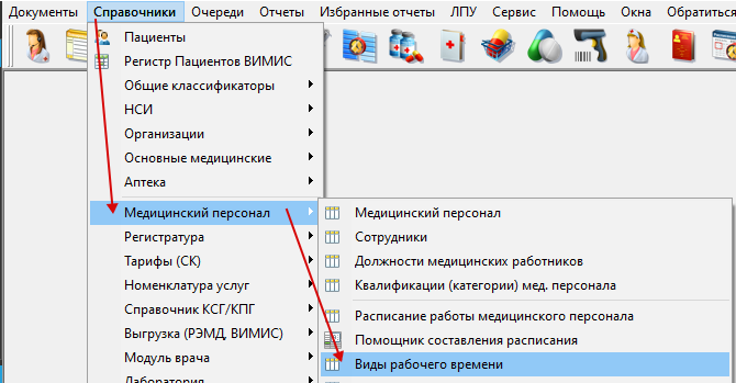 Виды рабочего времени предназначены для настройки расписания медицинских работников. Вызвать справочник видов рабочего времени можно с помощью меню «Справочники» → «Медицинский персонал» → «Виды рабочего времени» (рисунок1).