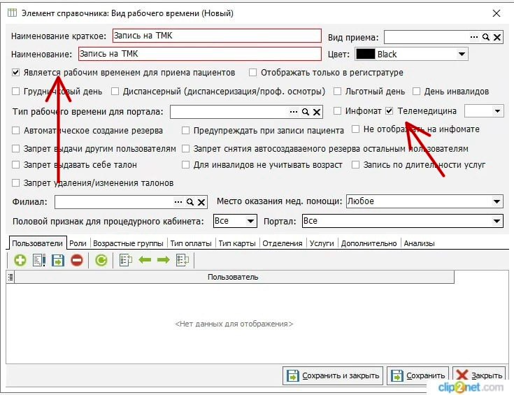 Затем проставляете галочки (как на рисунке 5). "Телемедицина" - настройка проведения телемедицинских консультаций и выбор формата онлайн-приема пациента. Если указывается конкретный формат онлайн-приема пациента, то на этот вид рабочего времени будет доступна запись только для телемедицины.