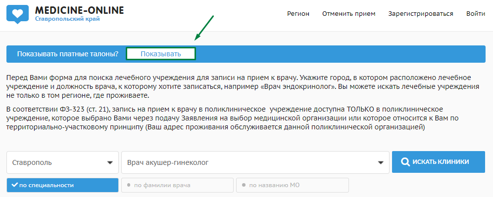 После выбора региона откроется главная страница портала медицина-онлайн. Для отображения платных услуг в поле «показывать платные талоны» необходимо нажать на кнопку «показывать».
