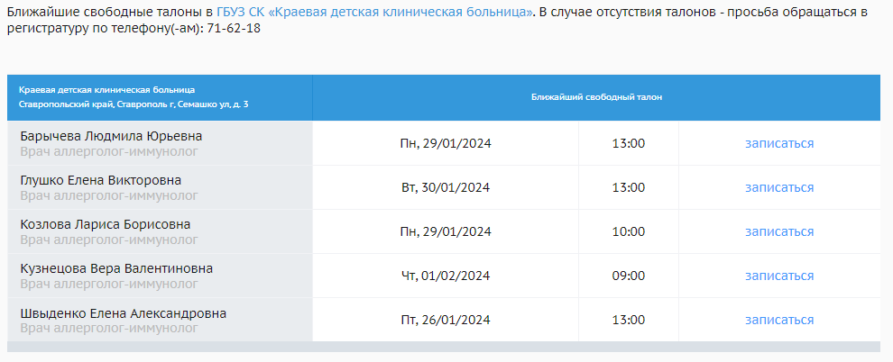 При нажатии на кнопку «ближайший прием» откроется окно с ближайшими свободными талонами для записи к врачу. Если дата и время подходит, то необходимо нажать кнопку «записаться».