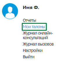 Так же взятый талон будет отображаться в разделе «мои талоны». Для перехода в раздел «мои талоны» необходимо нажать в правом верхнем углу на кнопку с ФИО и выбрать пункт меню «мои талоны».