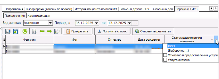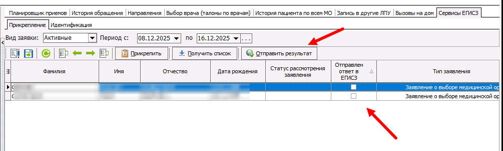Для отправки в ЕГИСЗ отработанных заявок нажать "отправить результат". Необходимо убедится что прославился чекбокс в колонке "Отправлен ответ в ЕГИСЗ"