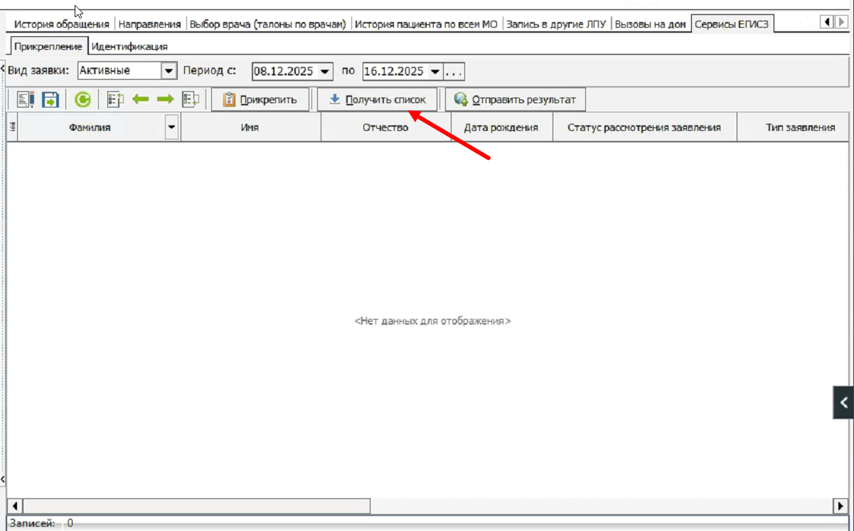 Для получения новых заявок необходимо нажать кнопку "Получить список".