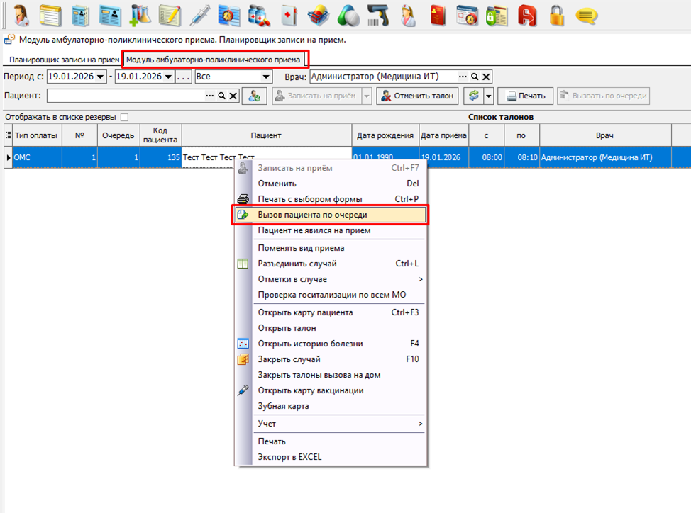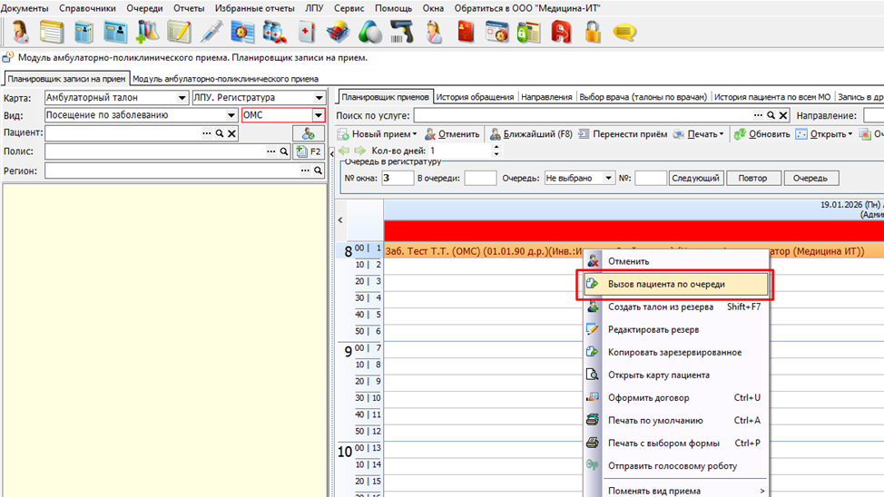 Через АПП и Планировщик приема и там и там нужно кликнуть на нужного пациента правой кнопкой и выбрать в меню пункт «Вызов пациента по очереди» (Рис 7,8,9)