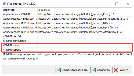 Далее необходимо заполнить логин и пароль для ФПУМП, так же надо проверить ссылки на корректность, которые заполняются автоматически для соответствующих сервисов, где
