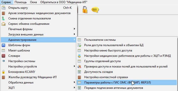 Для настройки параметров работы с ГИС ОМС (ФПУМП, ФЕРЗЛ) в МИС КСАМУ необходимо перейти в меню «Сервис» - «Администрирование» - «Параметры работы с ГИС ОМС (ФПУМП, ФЕРЗЛ)» (рисунок 1).