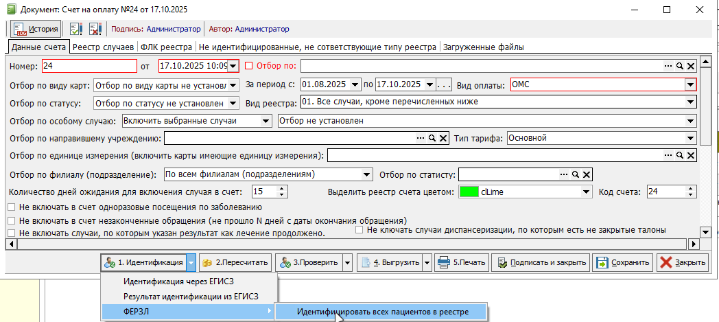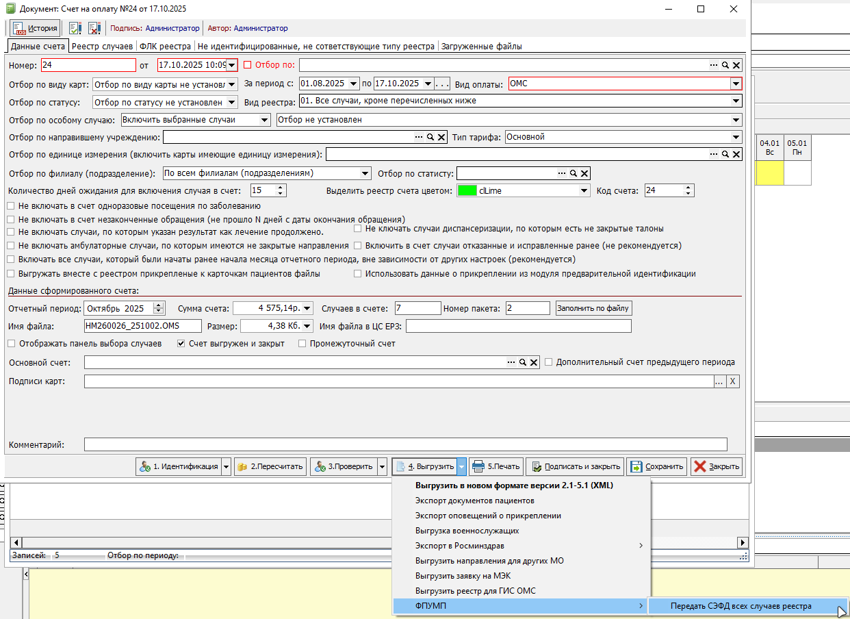 Для создания реестров счетов на оплату необходимо перейти в меню «Документы» - «Финансовые (счета и реестры)» - «Счет на оплату в страховую организацию». В созданном реестре в меню «1. Идентификация» расположена функция взаимодействия с ФЕРЗЛ «Идентифицировать всех пациентов в реестре» (рисунок 1), а также функция «Передать СЭФД всех случаев реестра» в меню «4. Выгрузить» - «ФПУМП» (рисунок 2).
