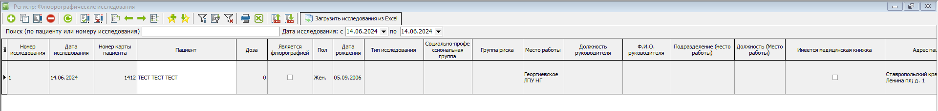 Работа в регистре "Флюорографические исследования" и внесение результатов исследования