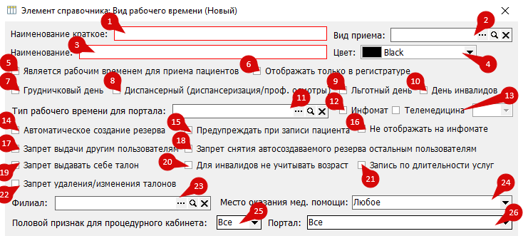 (6) - "Отображать только в регистратуре" − включить, если вид рабочего времени подразумевает запись пациентов только через регистратуру. При этом расписание, созданное на данный вид рабочего времени, не будет отображаться на инфомате для самозаписи и на порталах для записи через интернет.