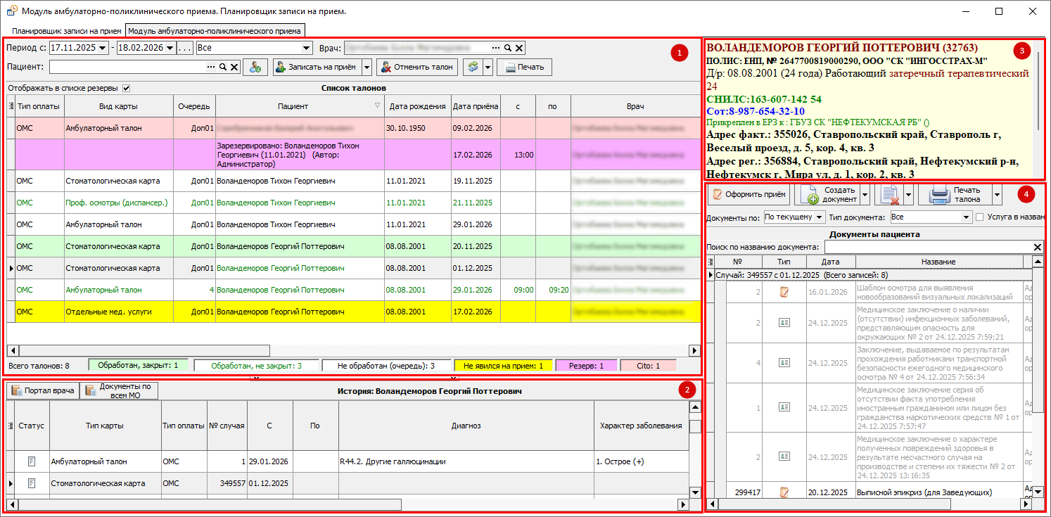 Модуль амбулаторно-поликлинического приёма (или «Модуль АПП») - это основное окно, в котором работает врач амбулатории. Визуально модуль можно разделить на 4 области (рисунок 1).