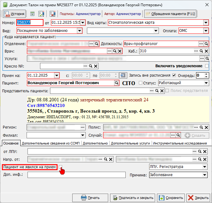При выборе записи на «доп. приёмы» всегда откроется окно с информацией о талоне, где можно скорректировать данные по приёму. В окне талона так же можно отразить информацию о том что пациент не явился на приём (рисунок 9), что так же отразиться визуально в модуле АПП.