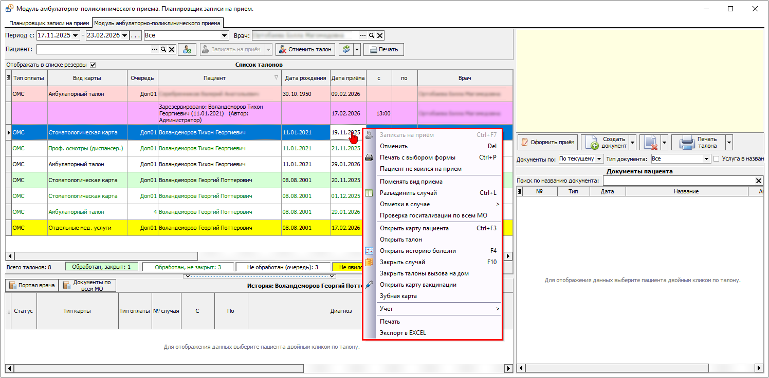 При нажатии правой кнопкой мыши на талон, откроется контекстное меню с дополнительным функционалом работы (рисунок 17).