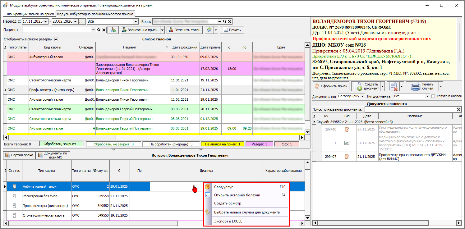 Для выбора пациента следует нажать двойным щелчком левой кнопки мыши по строке с информацией о нём. Если врачу необходимо оформить осмотр для другого случая, то следует отфильтровать талоны по нужному периоду и выбрать талон того случая, за который нужно добавить осмотр. При нажатии на выбранный талон правой клавишей мыши откроется контекстное меню (рисунок 12):
