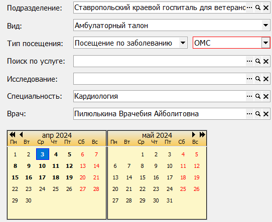 В данном окне выставляются параметры талона. В календаре в нижнем левом углу выбирается число, на которое нужно записать пациента (действия аналогичны работе в старом планировщике записи на прием). Для удобства работы, дни с свободным расписанием будут выделены жирным. Затем необходимо выбрать свободное время из таблицы справа, на которое пациенту будет удобно прийти и нажать на не него. Откроется знакомое окно с информацией о талоне, затем нажать на кнопку «Подписать и закрыть». Аналогичным образом, но меняя фильтры из левой группы (рисунок 4), можно направить пациента на приём к другим специалистам или на какие-либо манипуляции.