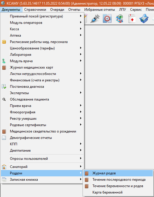 Для открытия Журнала родов, необходимо перейти: «Документы» → «Роддом» → «Журнал родов» (рисунок 1).
