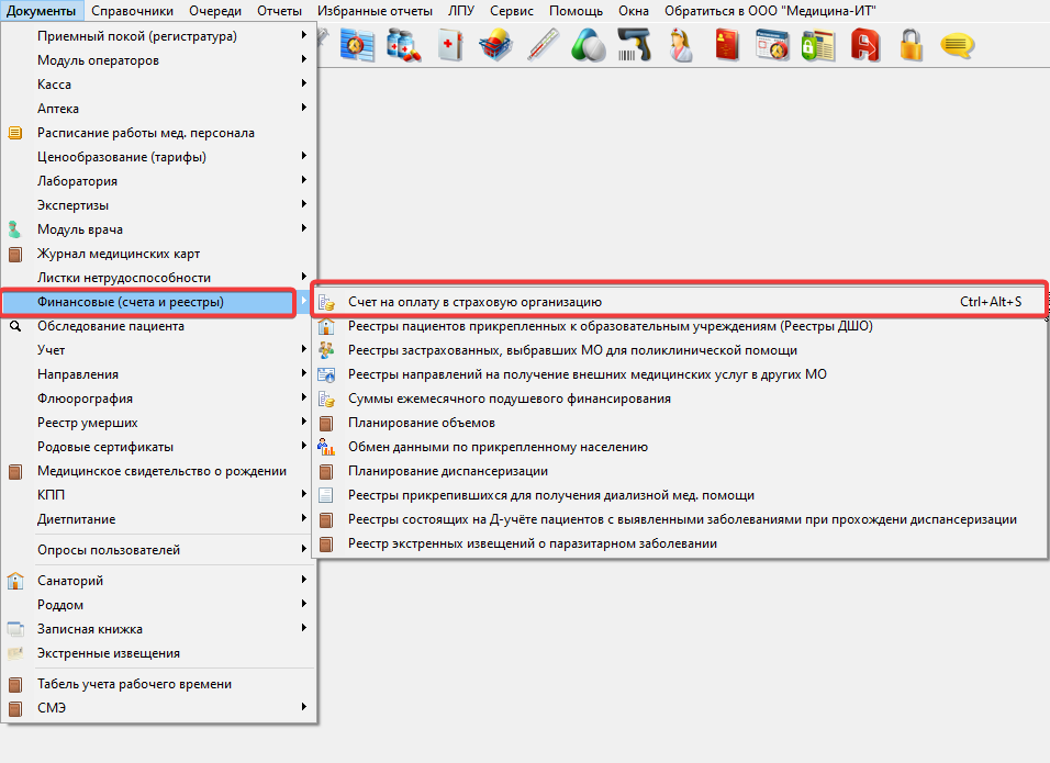 Для формирования счетов на оплату в страховые организации требуется открыть МИС «КСАМУ», выбрать пункт меню «Документы» → «Финансовые (счета и реестры)» → «Счета на оплаты в страховую организацию» или воспользоваться горячими клавишами Ctrl+Alt+S (рисунок 1)
