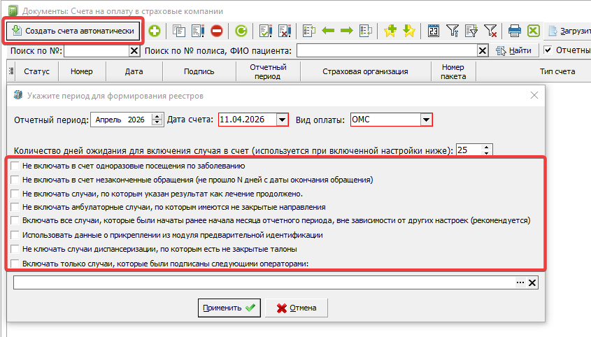 Кнопка (1) - Создает автоматически счета на оплату по подготовленным картам/случаям