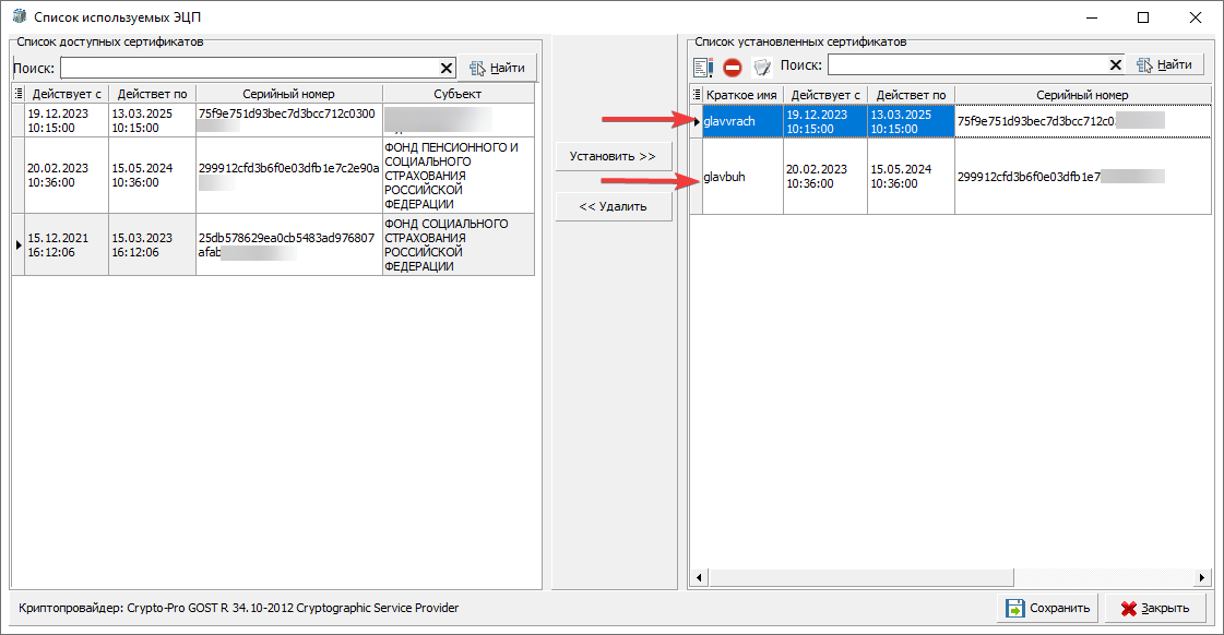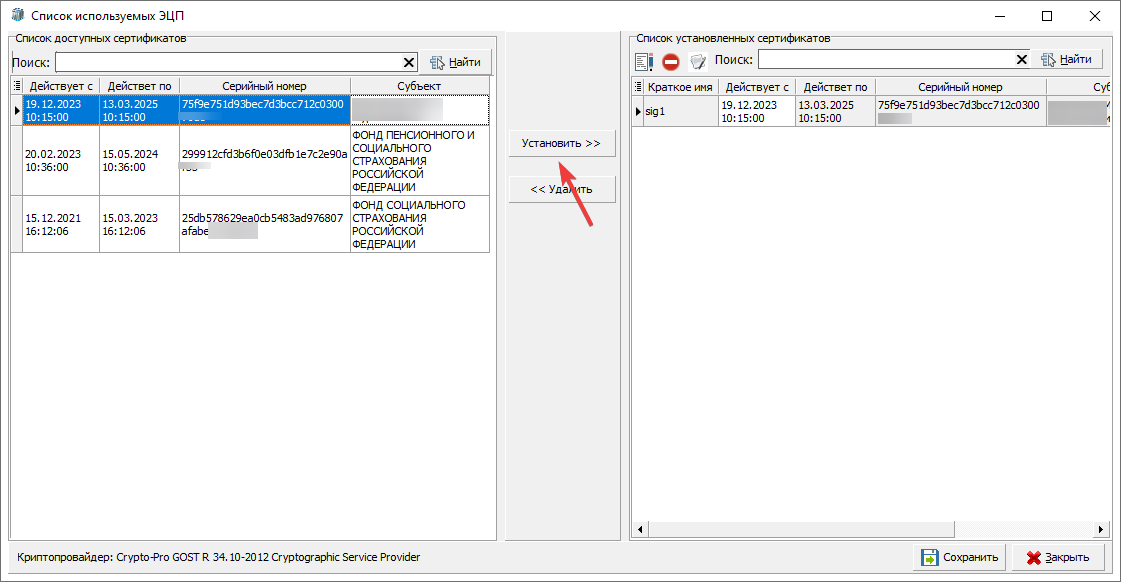 В открывшемся окне, на левой стороне таблицы, нужно выбрать актуальный сертификат и нажать кнопку "Установить" (рисунок 2).
