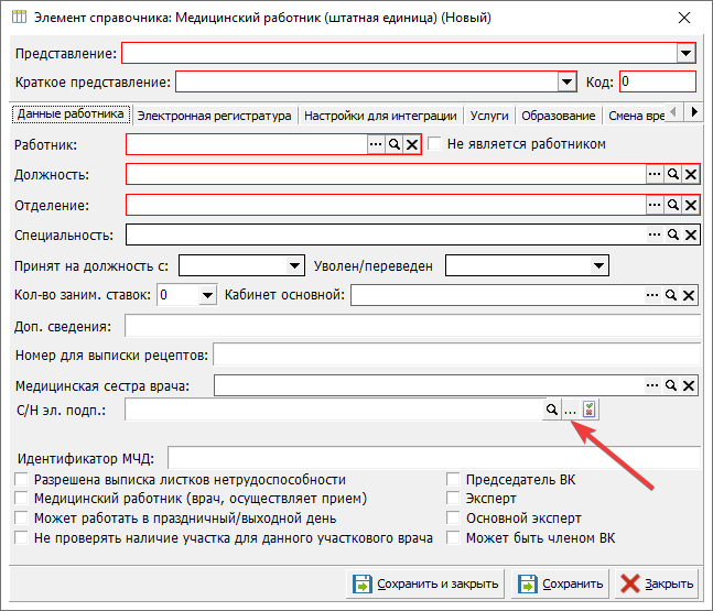 В открывшемся окне найти главного врача и главного бухгалтера. Открыть их карты и на вкладке "Данные работника" выбрать актуальный сертификат ЭЦП в поле "С/Н эл. подп."(рисунок 5).