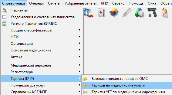 Тарифы на медицинские услуги и услуги диспансеризации в КСАМУ находятся в пункте меню "Справочники" - "Тарифы (КЧР)" - "Тарифы на медицинские услуги" (рисунок 1, 2).