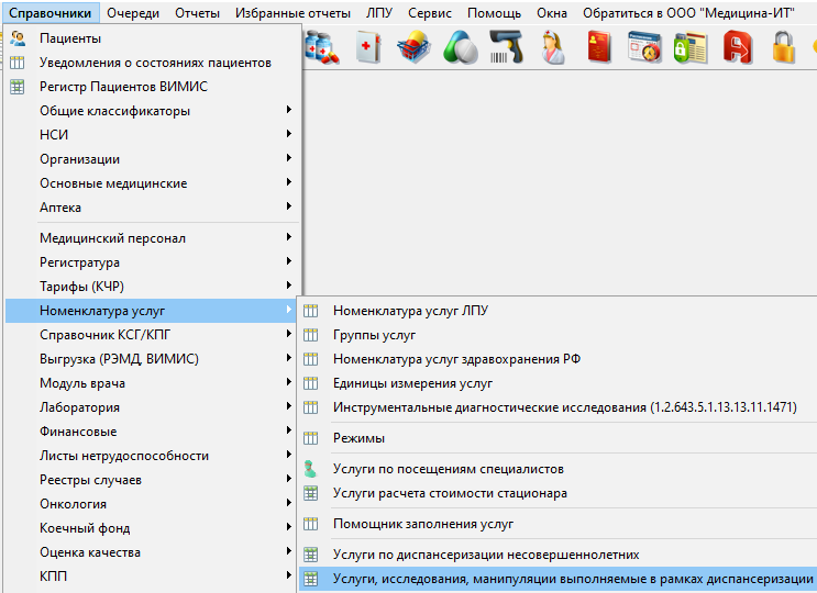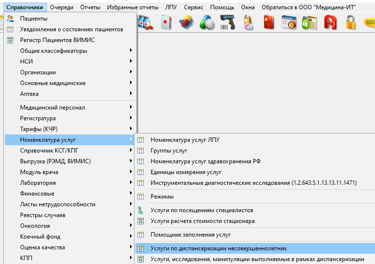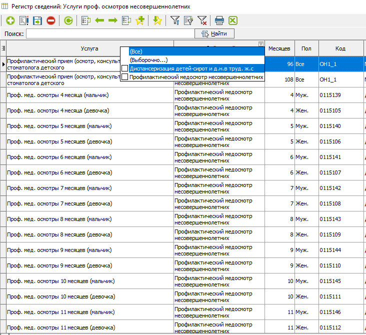 В КСАМУ в пункте меню "Справочники" - "Номенклатура услуг" - "Услуги по диспансеризации несовершеннолетних" (рисунок 5) находится перечень услуг и исследований сопоставленный по возрасту (в месяцах) и полу пациента (рисунок 6). Данный перечень сопоставлен в соответствии с 212н и 211н приказами МЗ РФ для диспансеризации детей сирот и детей находящихся в трудной жизненной ситуации и для профилактических медицинских осмотров несовершеннолетних.