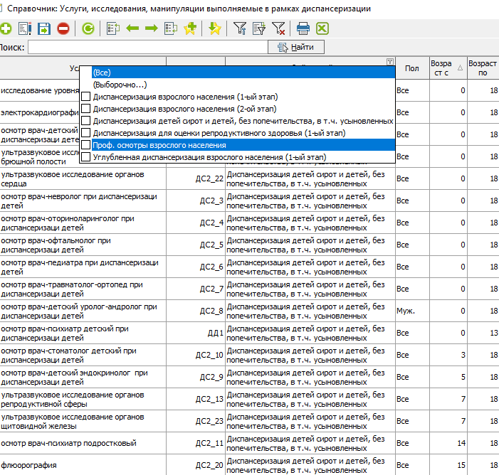 В КСАМУ в пункте меню "Справочники" - "Номенклатура услуг" - "Услуги, исследования, манипуляции выполняемые в рамках диспансеризации" (рисунок 3) находится перечень услуг и исследований сопоставленный по возрастному диапазону (в годах) и полу пациента (рисунок 4). Данный перечень сопоставлен в соответствии с 404н, 698н, 378н, 275н приказами МЗ РФ.