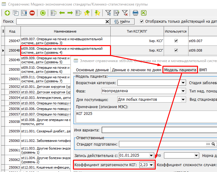 В открывшемся окне "Медико-Экономические стандарты/Клинико-статистические группы" найти нужное КСГ и открыть его двойным кликом мышки. В окне КСГ необходимо перейти на вкладку "Модель пациента", поле "Коэффициент затратоемкости КСГ" (рисунок 11).
