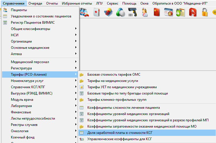 Доля заработной платы для КСГ в КСАМУ расположена в меню "Справочники" - "Тарифы (РСО-Алания)" - "Доля заработной платы в стоимости КСГ" (рисунок 22, 23).