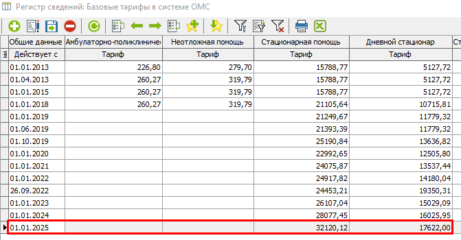 В открывшемся окне "Базовые тарифы в системе ОМС" (рисунок 7) необходимо найти строку текущего года и сверить соответствующие значения с приложением 27 (рисунок 8) и 32 (рисунок 9).