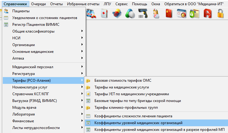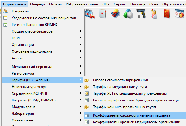 Коэффициенты сложности лечения пациента (КфСЛ) в КСАМУ расположены в меню "Справочники" - "Тарифы (РСО-Алания)" - "Коэффициенты сложности лечения пациента" (рисунок 19, 20).