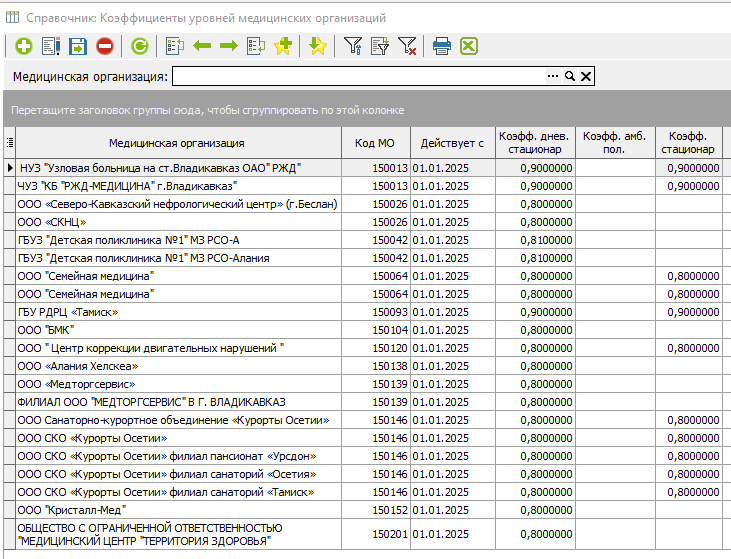 Коэффициент подуровня медицинской организациив КСАМУ находится в пункте меню "Справочники" - "Тарифы (СК)" - "Коэффициенты уровней медицинской организации" (рисунок 17).