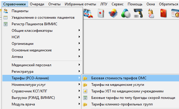 Базовая ставкав КСАМУ находится в пункте меню "Справочники" - "Тарифы (РСО-Алания)" - "Базовая стоимость тарифов ОМС" (рисунок 6).