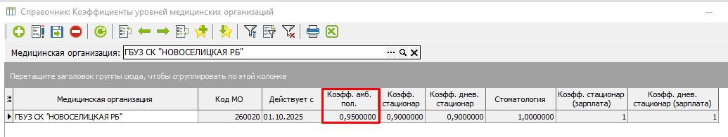 В открывшемся окне "Коэффициенты уровней медицинских организаций" необходимо найти строку текущего года (рисунок 3). В колонке "Коэфф. амб. пол." сверить данные с таблицей 1 (рисунок 1).