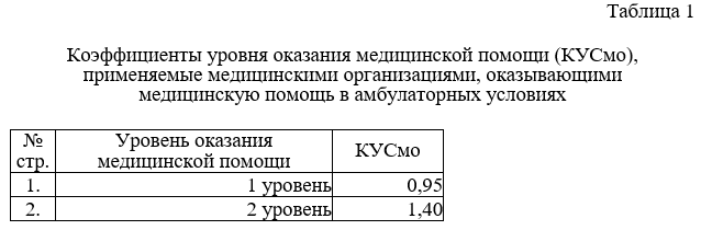 Коэффициенты уровня оказания медицинской помощи (КУСмо), применяемые медицинскими организациями, оказывающими медицинскую помощь в амбулаторных условиях описаны в таблице 1, после пункта 3.2.8 (рисунок 1).