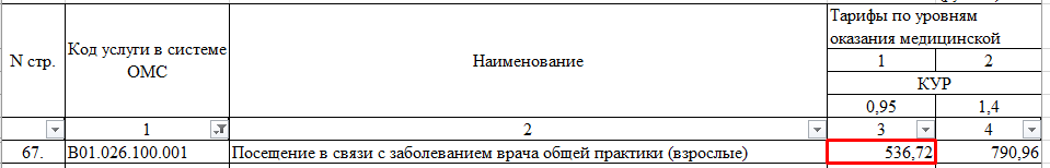Для примера возьмем услугу "B01.026.100 1. Посещение в связи с заболеванием врача-общей практики" для взрослого пациента с уже рассчитанной суммой 536.72 (рисунок 6).