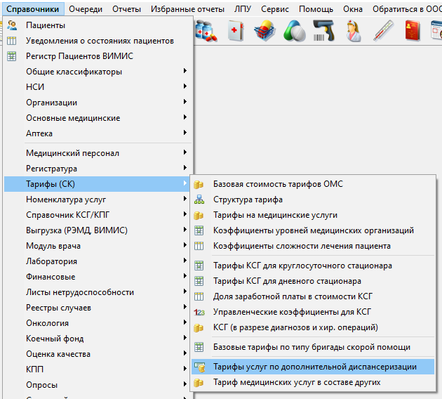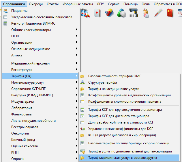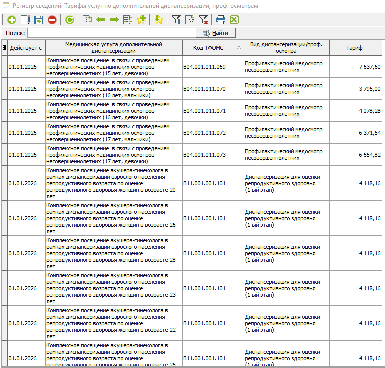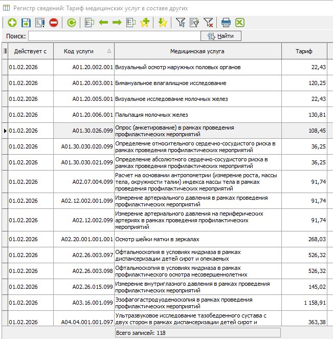 Тарифы на составные услуги из комплекса диспансеризации/профосмотра находятся в пункте меню "Справочники" - "Тарифы (СК)" - "Тарифы медицинских услуг в составе других" (рисунок 6, 7).