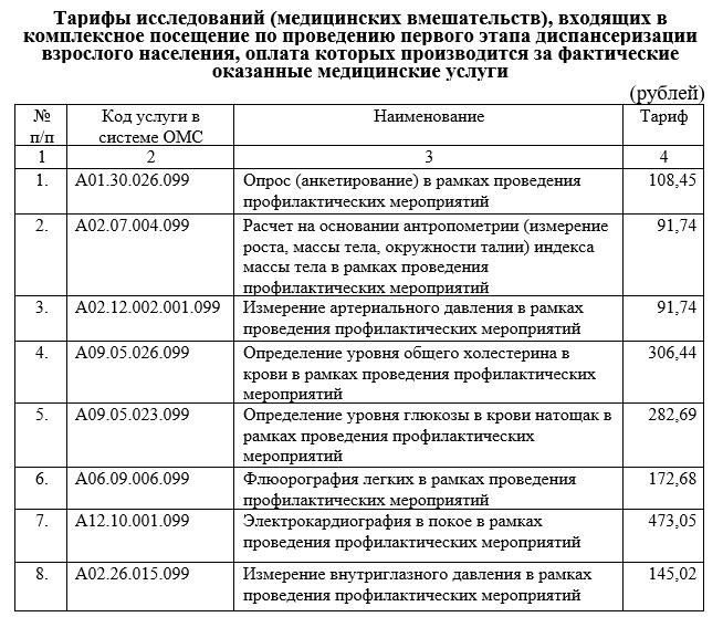 -Приложение 10.Тарифы диспансеризации: первый этап диспансеризации взрослого населения; второй этап диспансеризации взрослого населения; диспансеризация детей сирот и детей, находящихся в трудной жизненной ситуации; диспансеризации детей сирот и детей, оставшихся без попечения родителей, в т.ч. усыновленных; углубленная диспансеризация, диспансеризация для оценки репродуктивного здоровья.На услуги из данного приложения не применяется КУСмо.При проведении диспансеризации мобильной медицинской бригадой или в выходной/праздничный день используется повышающий коэффициент - 1,05.