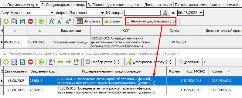 В КСАМУ антимикробная терапия при оформлении карты вносится в манипуляции, а в табличной части карты проставляется основное КСГ для оплаты (рисунок 1). В рамках одной истории болезни (случая) может быть указано как одно, так и несколько КСГ по антимикробной терапии.