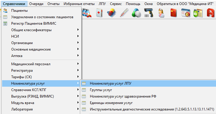 Чтобы КСГ можно было выбирать в манипуляции их нужно внести в номенклатуру услуг как услугу. Для этого необходимо перейти в пункт меню "Справочники" - "Номенклатура услуг" - "Номенклатура услуг" (рисунок 2).