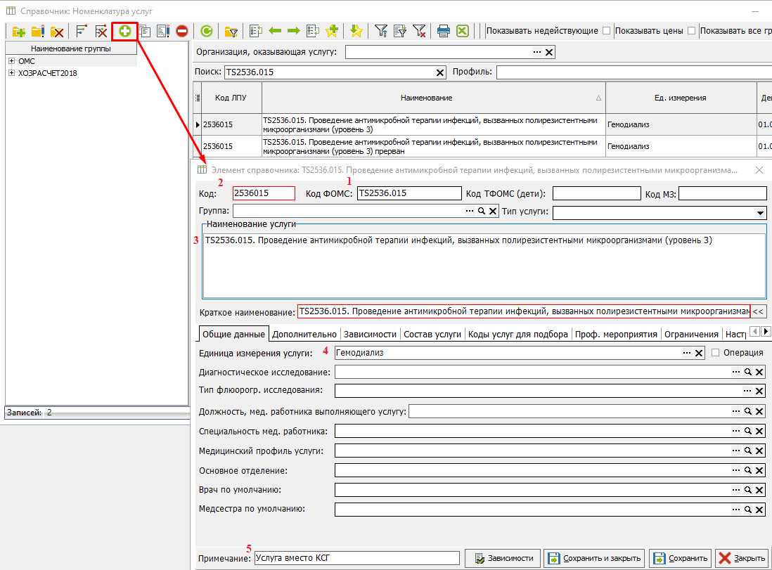 5. В поле примечание можно ввести опознавательный признак "Услуга вместо КСГ".
