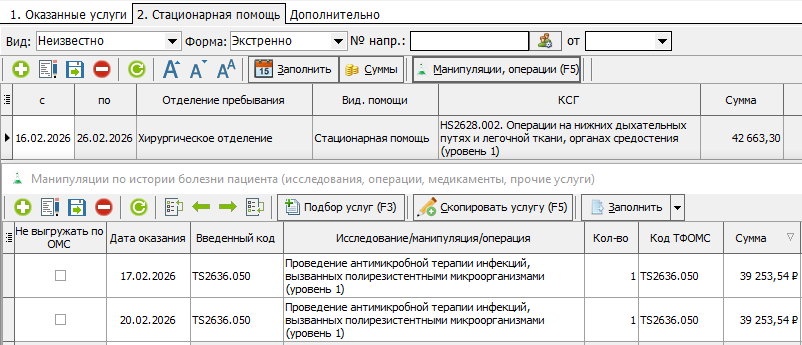В КСАМУ антимикробная терапия при оформлении карты вносится в манипуляции, а в табличной части карты проставляется основное КСГ для оплаты (рисунок 1). В рамках одной истории болезни (случая) может быть указано как одно, так и несколько КСГ по антимикробной терапии.
