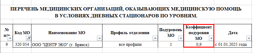 -Приложение 3.Содержит перечень МО, оказывающих медицинскую помощь в условиях дневного стационара и коэффициент подуровня (КУСмо) (рисунок 3).